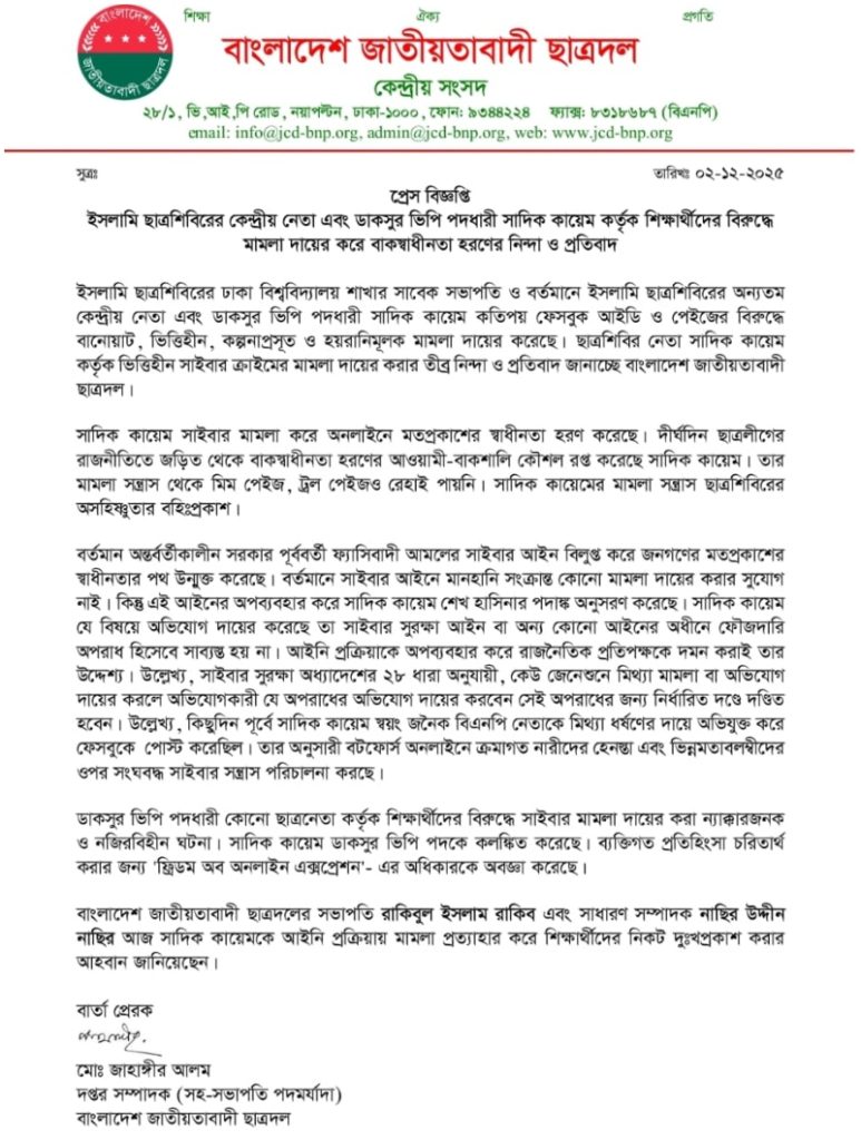 ছাত্রশিবিরের কেন্দ্রীয় নেতা ও ডাকসু ভিপি পদধারী সাদিক কায়েম কিছু ফেসবুক আইডি ও পেইজের বিরুদ্ধে বানোয়াট ও ভিত্তিহীন সাইবার মামলা দায়ের করেছেন। বাংলাদেশ জাতীয়তাবাদী ছাত্রদল এই মামলার তীব্র নিন্দা ও প্রতিবাদ জানিয়েছে।