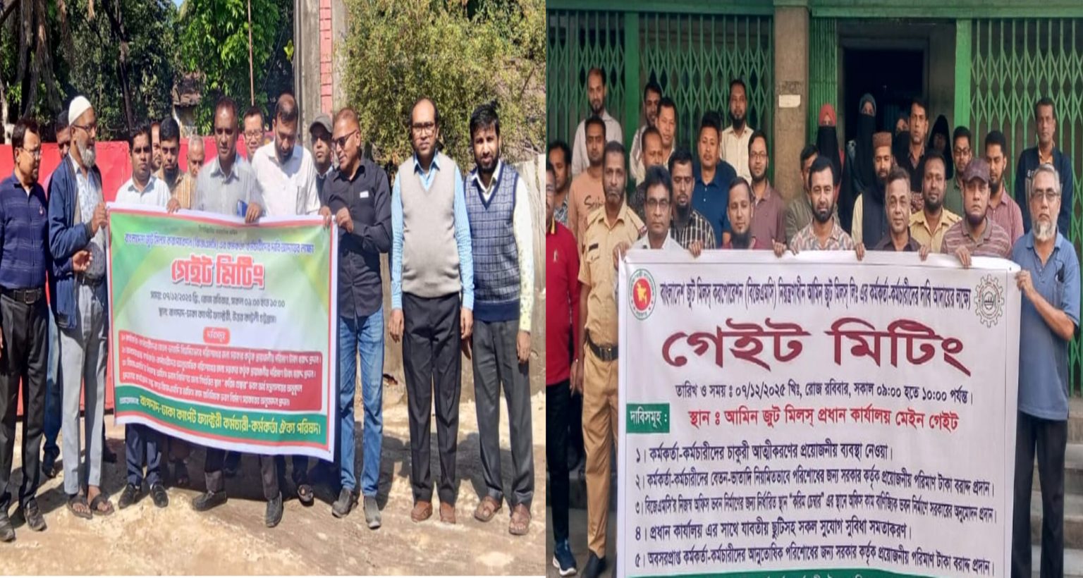 বিজেএমসি নিয়ন্ত্রিত বিভিন্ন পাটকলের কর্মকর্তা-কর্মচারীদের নিয়মিত বেতন-ভাতা প্রদান ও অবসরপ্রাপ্ত কর্মকর্তা-কর্মচারীদের আনুতোষিক পরিশোধ নিশ্চিত করার দাবিতে চট্টগ্রাম অঞ্চলের মিলগুলোতে গেইট মিটিং অনুষ্ঠিত হয়েছে।