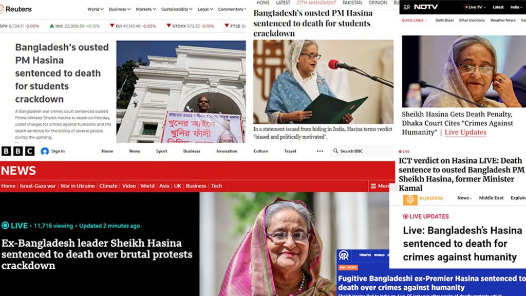 গণ-অভ্যুত্থানের মাধ্যমে ক্ষমতাচ্যুত সাবেক প্রধানমন্ত্রী শেখ হাসিনাকে মৃত্যুদণ্ড দিয়েছেন আন্তর্জাতিক অপরাধ ট্রাইব্যুনাল-১। শেখ হাসিনার মৃত্যুদণ্ডের খবরটি বেশ গুরুত্ব দিয়ে প্রকাশ করেছে আন্তর্জাতিক গণমাধ্যমগুলো। পশ্চিমা বিশ্বের গণমাধ্যম থেকে শুরু করে ভারতসহ দক্ষিণ এশিয়ার বিভিন্ন দেশের গণমাধ্যম এ বিষয়ে আজ সোমবার প্রধান খবর প্রকাশ করেছে।