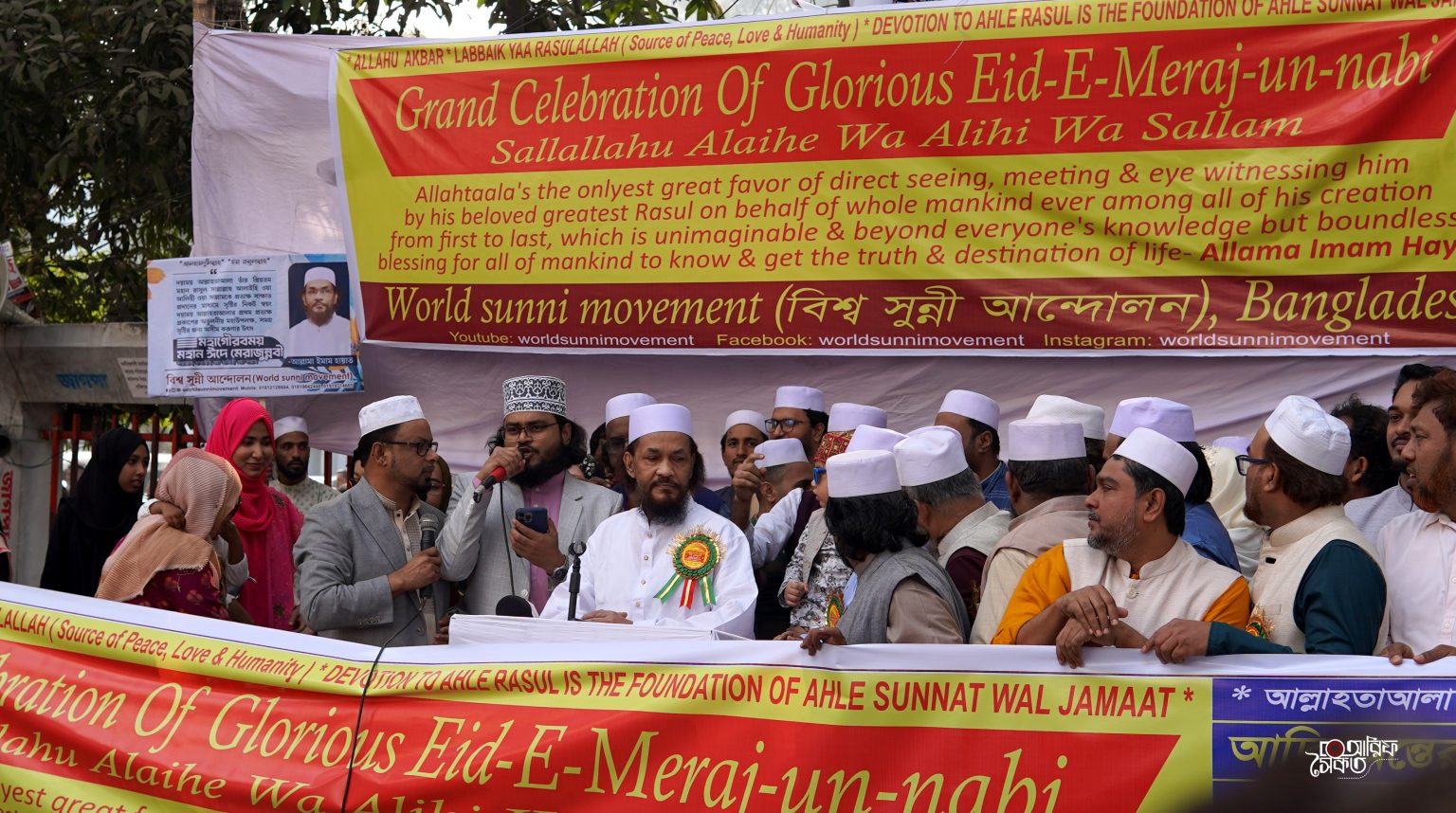 পবিত্র ঈদে মেরাজুন্নবী সাল্লাল্লাহু আলাইহি ওয়া আলিহী ওয়া সাল্লাম উদযাপন উপলক্ষে বিশ্ব সুন্নী আন্দোলনের উদ্যোগে রাজধানীতে বর্ণাঢ্য শোভাযাত্রা ও সমাবেশ অনুষ্ঠিত হয়েছে। আজ ঢাকা প্রেসক্লাবের সামনে আয়োজিত সমাবেশ শেষে একটি বর্ণাঢ্য শোভাযাত্রা নগরীর বিভিন্ন সড়ক প্রদক্ষিণ করে।