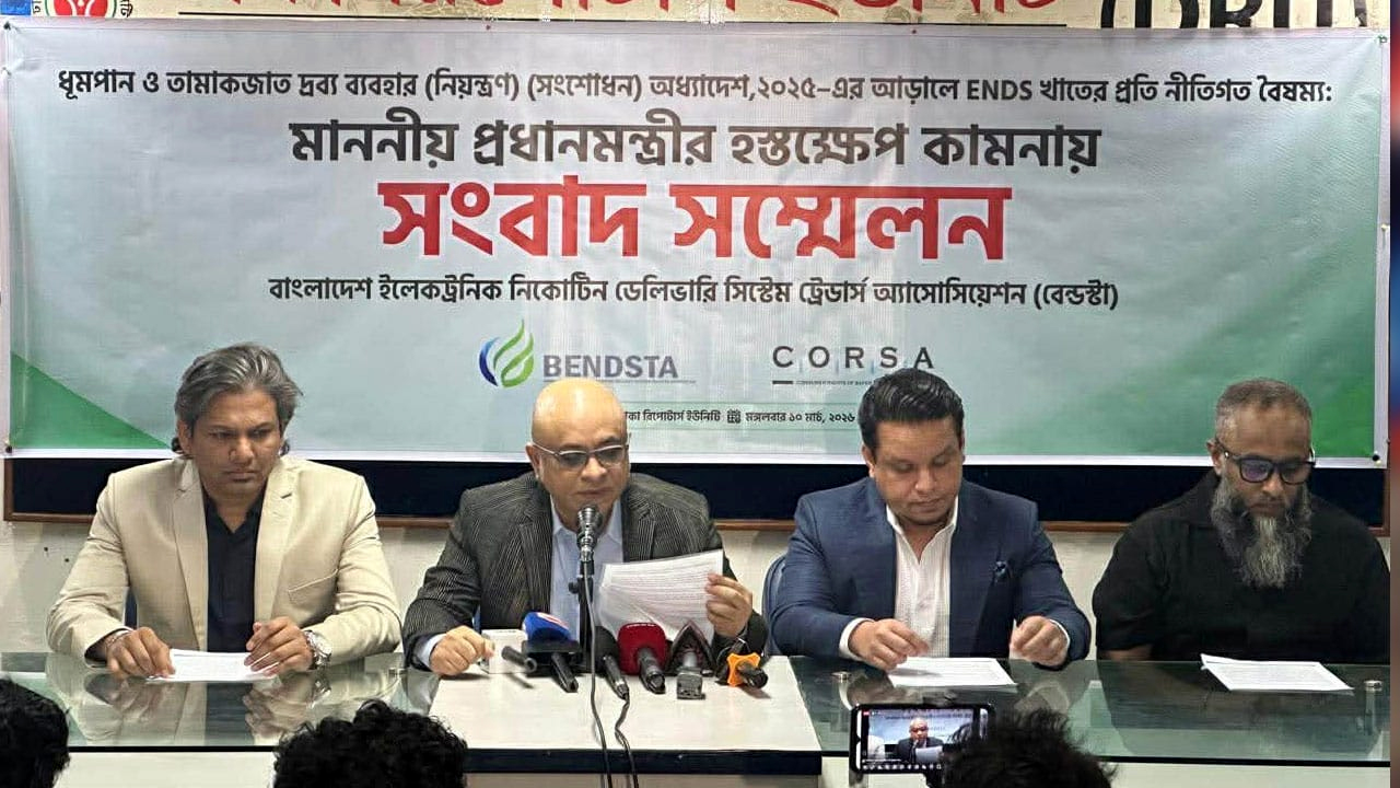 ধূমপান ও তামাকজাতদ্রব্য ব্যবহার নিয়ন্ত্রণ অধ্যাদেশ-২০২৫ এ ইলেকট্রনিক নিকোটিন ডেলিভারি সিস্টেম (ইএনডিএস) বা ভেপ পণ্যের ওপর আরোপিত নিষেধাজ্ঞা পুনর্বিবেচনার জন্য প্রধানমন্ত্রীর হস্তক্ষেপ কামনা করেছে বাংলাদেশ ইলেকট্রনিক নিকোটিন ডেলিভারি সিস্টেম ট্রেডার্স অ্যাসোসিয়েশন (বেন্ডস্টা)।